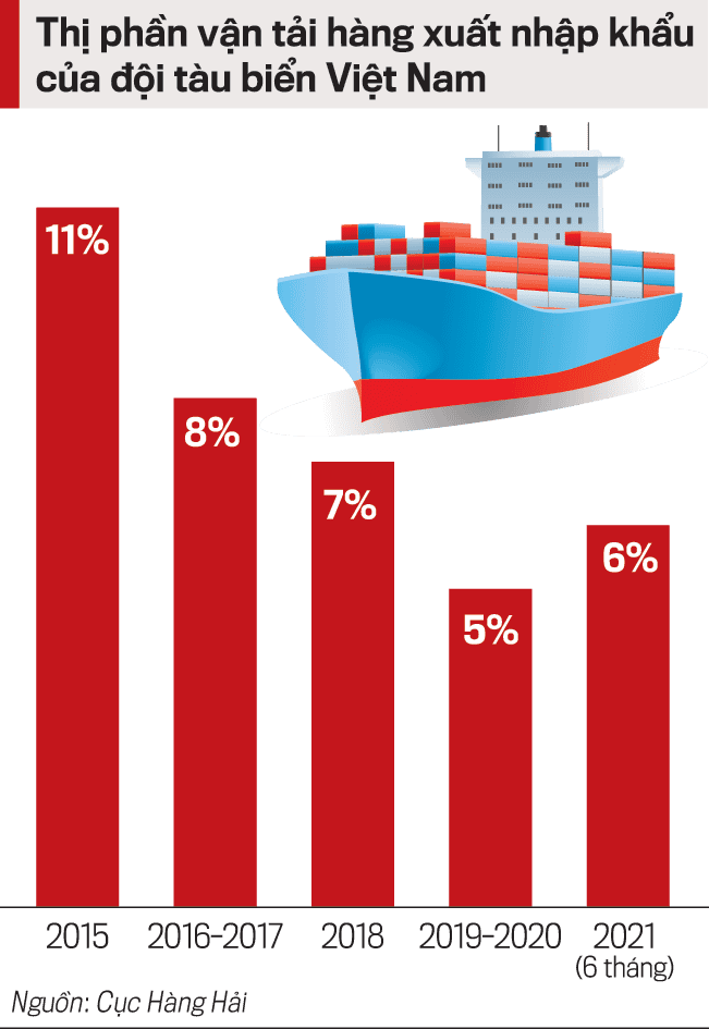 Tuy nhiên, thị phần vận tải hàng hóa xuất nhập khẩu của đội tàu vận tải biển Việt Nam ngày càng giảm. Năm 2015, đảm nhận 11% thị phần, đến năm 2018 giảm xuống 7%, có lúc chạm đáy chỉ còn 5%. Thị trường vận chuyển quốc tế của đội tàu vận tải biển của Việt Nam chủ yếu chạy tuyến ngắn như Trung Quốc, Đông Nam Á, Châu Á.